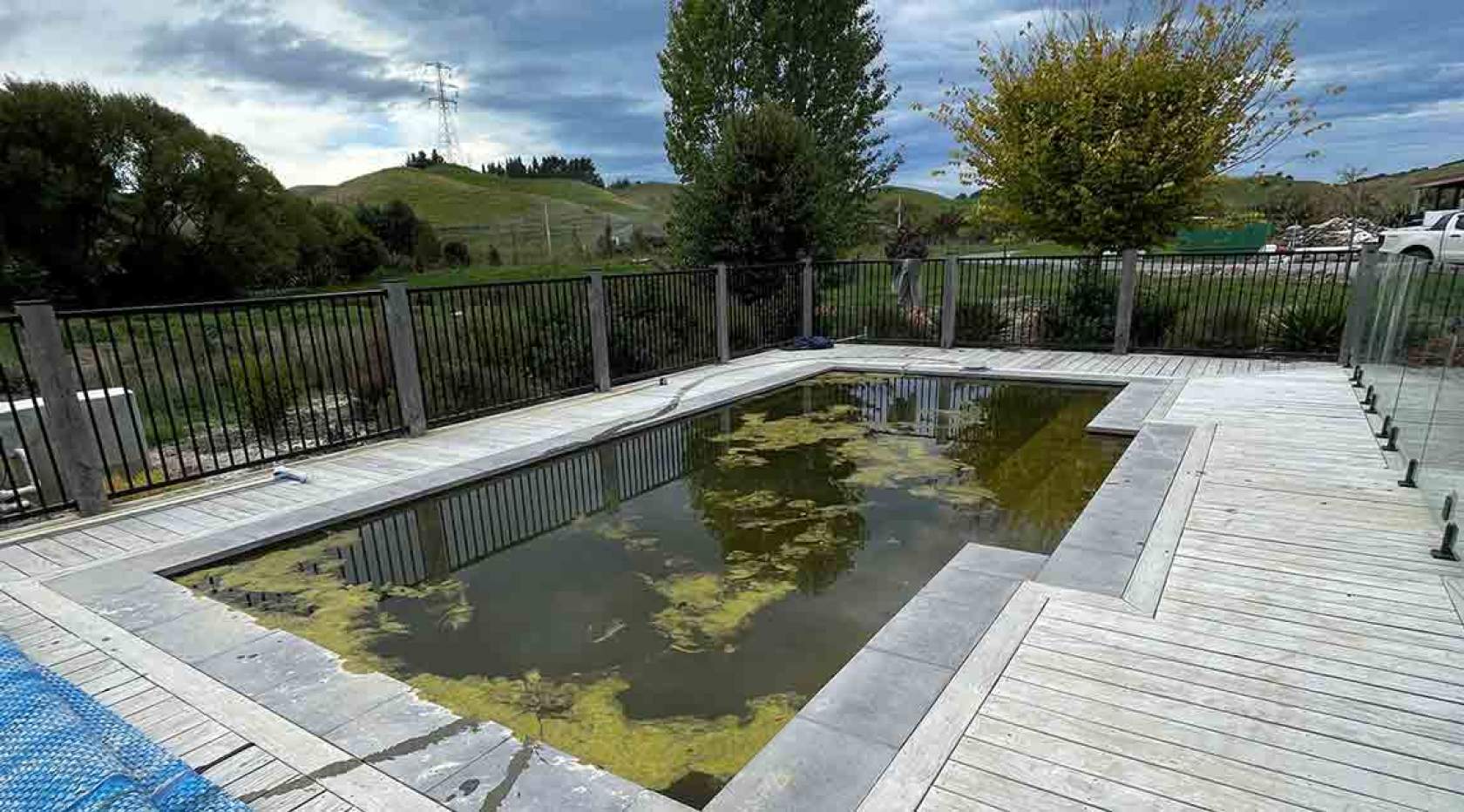 The soil residue from nearby pine logging had washed down the mountains and into the pools. The water was green with up to 1.5 metres of silt in the pools, the growing bacteria making the water a health hazard. Some people had cleared the decks and the tiling surrounding the pools, but others hadn’t – their pools were sitting, waiting.