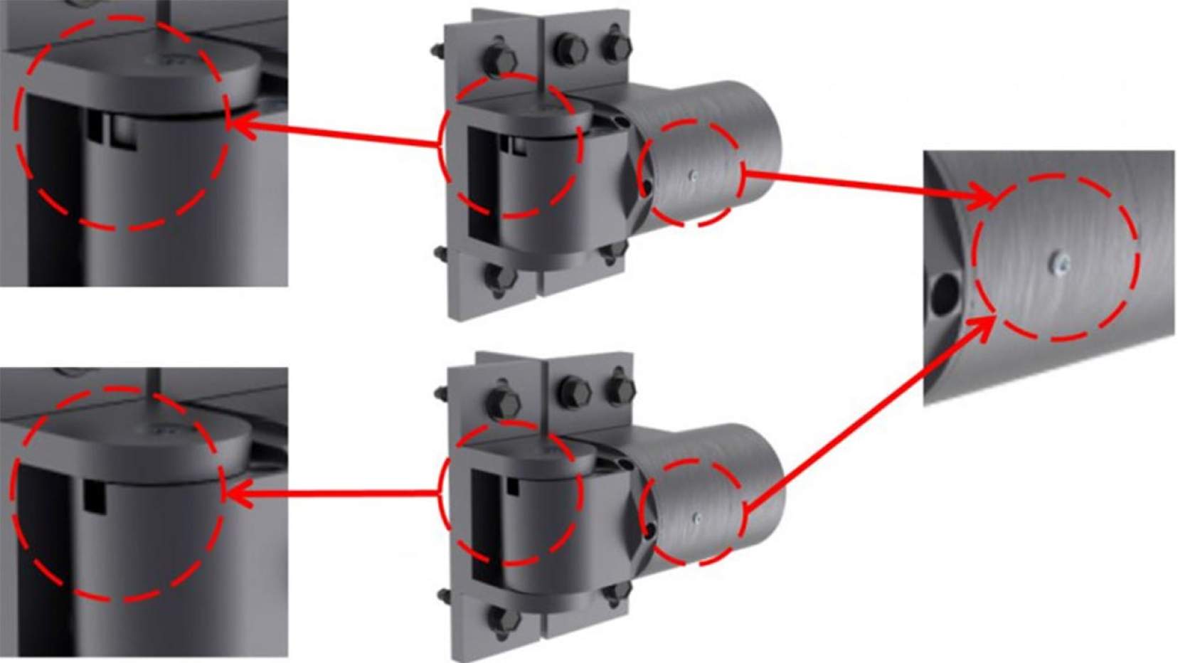 CAPTION: The SureClose Readyfit 180° Hinge-Closer Kit contains a pair of hinge-closers with dimples on the end