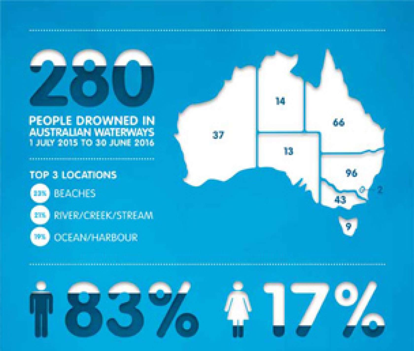 Over the period from 1 July 2015 and 30 June 2016 there was a decrease of 31 per cent of pool drownings for under-fives, compared to the 10-year average. The 11 drownings were 36 per cent less than the 14 that occurred over the same period last year.