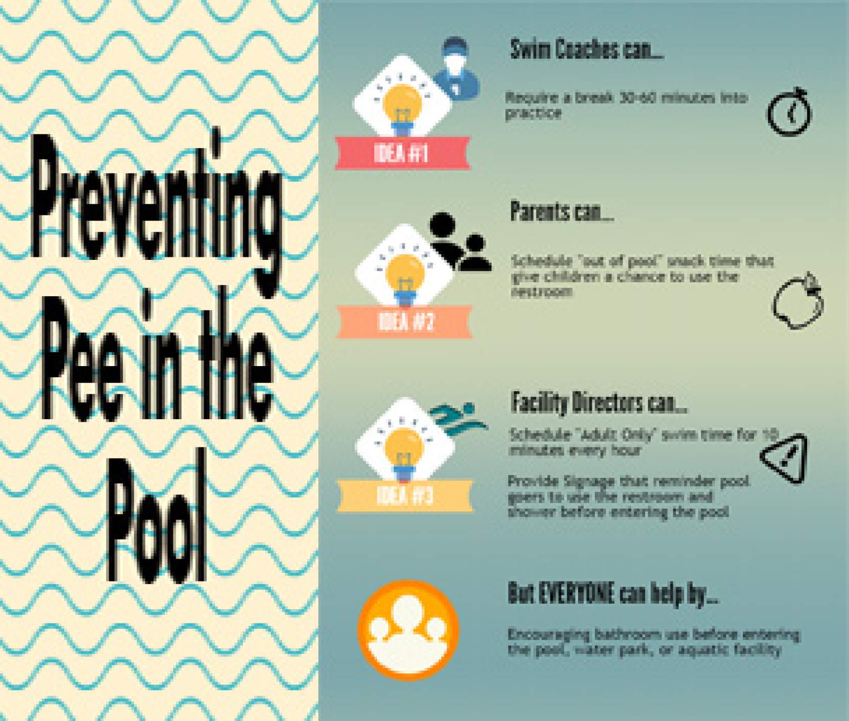 Facility Managers should consider two ways to prevent pee in the pool. First, schedule short breaks to encourage people to exit the water. For example, a 10-minute “adult only” swim time or an out-of-pool activity every hour encourages people to exit the pool and use the bathroom. Second, post signage that suggests using the bathroom and showering before getting into the pool.